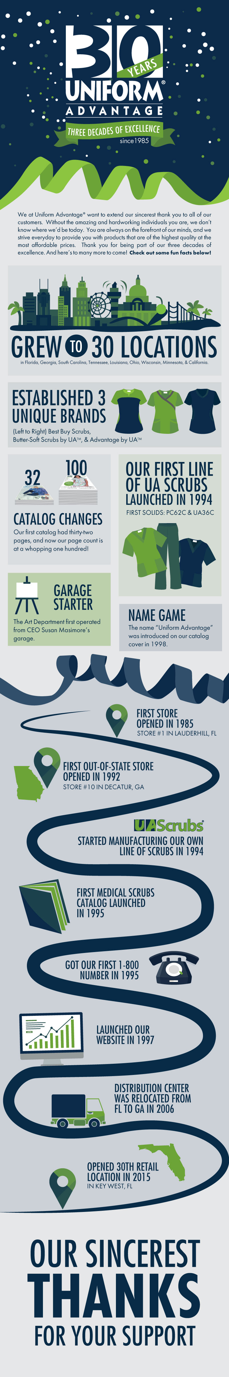 Everyone at Uniform Advantage (UA) is excited to celebrate its 30th Anniversary this year! Our culture is family oriented and relationships is of the utmost importance to us - with our employees, our customers and our business partners. Together, we have all built a strong foundation and brought a vitality and synergy contributing to the success and prosperity of the last 30 years. We are reflecting on our beginnings, evaluating and improving our present and charging forward to our future! We started with 1 store in Lauderhill, grown to 30 as well as launched an e-commerce and catalog division. It has been a beautiful journey of ups and downs, lots of laughs and crying, great products as well as plenty aha moments!