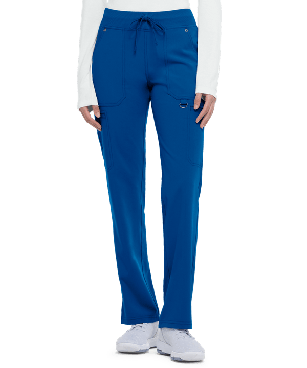 Product Details The Dickies Xtreme Stretch DK020P Rib Knit Cargo Scrub Pants feature a mid-rise with a straight leg style. The stretch rib knit waistband includes a drawstring closure. Ankle vents provide ease of mobility. These flexible scrub pants have 6 pockets: 2 front slash pockets with a D-ring on the left, 2 cargo pockets, and 2 back pockets. Made of 75/21/4 poly/rayon/spandex, while rib knit is 96/4 poly/spandex.