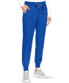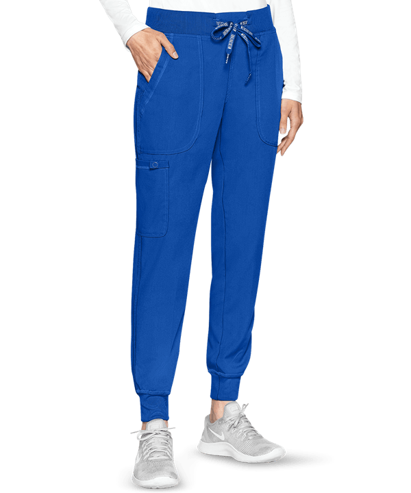 Product Details The Med Couture Touch 7710P Yoga Jogger Scrub Pants feature a mid rise and tapered legs with rib knit elastic ankle cuffs. These joggers have a rib knit elasticized waistband with front drawstring and back yoke. For storage, there are 5 pockets: 2 front slash pockets with rib knit gusset, 2 back patch pockets, and 1 cargo pocket on the right side that includes an accessory loop with snap. The fabric content is 77/20/3 poly/rayon/spandex, except for Slate (Heather) which is 75/19/6 poly/rayon/spandex. Rib knit is 92/8 poly/spandex.