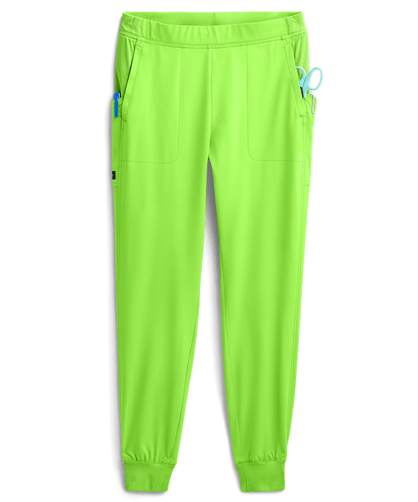 Product Details The koi planet koi 744P Scrubs Cherish PETITE Jogger Scrub Pants features a contemporary fit, mid-rise, tapered leg jogger design, flat front with tonal rib knit back elastic waistband, tonal rib knit ankle cuffs, double stitching side seam details, tonal rib knit back yoke that extends into front pockets and 4 pockets; 2 front vertical in seam welt pockets and an angled side slip pocket on each side. Fabric content is moisture wicking, quick dry, 55/38/7 poly/ recycled poly/spandex, rib knit is 95/5 recycled poly/spandex.